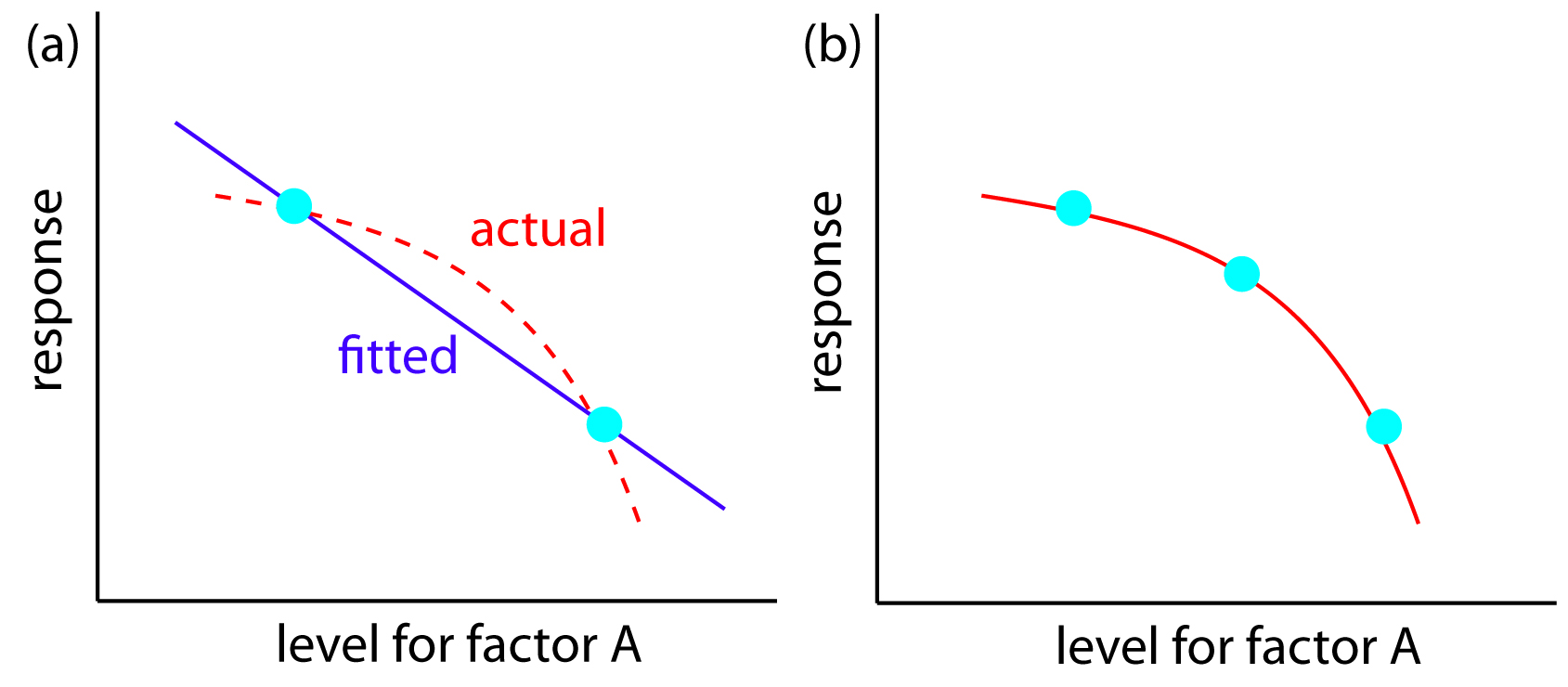 하지만 2N Factorial Design에서는 한 개의 변수에 두 개의 수준 값만 입력하였으므로, 곡선 방정식을 얻기에 입력이 불충분하여서 2차함수 효과(second order effect)를 구할 수 없는 단점이 있다.