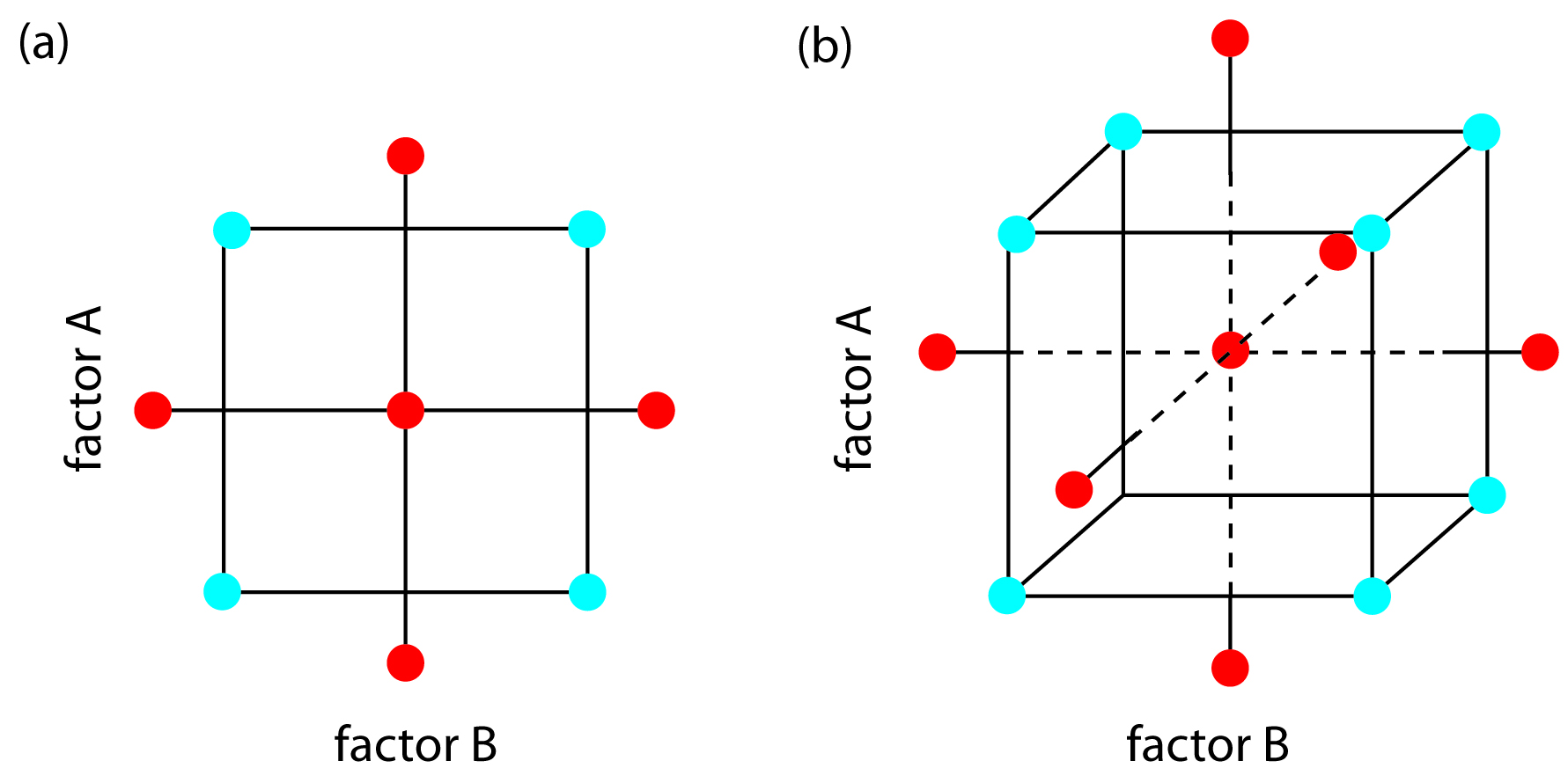 그림 7. 변수가 2개 (a)와 3개 (b)인 Central Composite Design (CCD). 푸른 점은 Factorial Design에 해당하는 점들이고, 붉은 점은 Star Design에 해당하는 점들이다.9