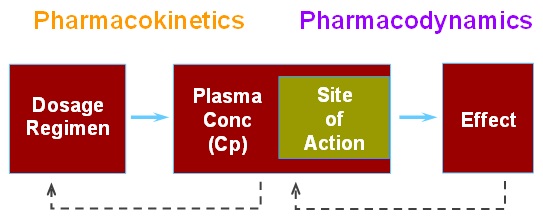 약을 투약하면 아래 그림 1과 같이 약동학 및 약력학적인 과정을 거쳐서 치료효과 및 이상반응이 발현된다. 따라서 약동학과 약력학은 약의 특성을 이해하기 위한 기본적인 정보이다.