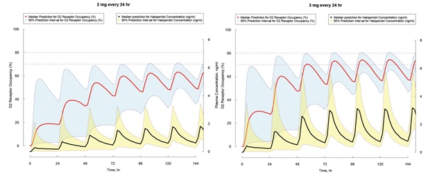 그림 2. 여러 용량으로 haloperidol 반복 투여시 stochastic simulation에 의한 혈중 약물 농도와 haloperidol-Dopamine type 2 (D2) 수용체 결합 변화에 대한 예측