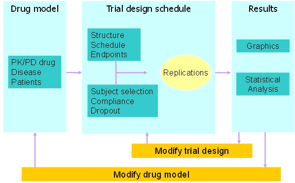 임상시험 시뮬레이션은 임상시험을 컴퓨터 상에서 가상적으로 수행하는 것이다. 이를 통해 최적의 임상시험 디자인을 설계하는 등 다양한 상황에 활용할 수 있다. 임상시험은 약과 사람에서의 반응을 표현하는 약동 혹은 약력학 모델을 이용한 단순 시뮬레이션과는 달리 실제 임상시험에서 있을 수 있는 요소들이 반영되어야 하므로 이에 따라 아래와 같은 추가적인 요소가 필요하다.