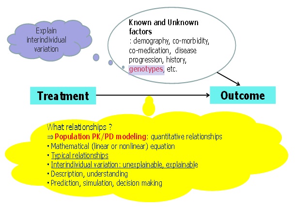 동일한 약물을 동일한 용량, 용법으로 투여하였는데도 불구하고 치료효과 및 부작용의 차이가 있다는 것은 이들 치료 결과에 영향을 주는 약물 이외의 다른 요소가 있다는 것을 의미하며 이러한 요소를 찾아내는 것은 약물의 개인별 최적화된 약물치료를 위해서도 필수적인 정보이다 (그림 4). 개개인별로 적은 수의 자료로도 분석이 가능한 것은 집단약동-약력학의 매우 중요한 특징이다. 이러한 특성은 임상시험 디자인의 유연성을 높여 선택의 폭을 넓히며, 임상시험에 참여하는 개별 피험자들의 임상시험 참여에 대한 부담을 줄여 더 많은, 더 다양한 특성을 지닌 (heterogenous) 환자들을 대상으로 할 수 있다. 그럼으로써 약물 치료 시, 치료효과 및 부작용의 개인간 차이에 영향을 미치는 요소를 발견할 가능성을 높인다.