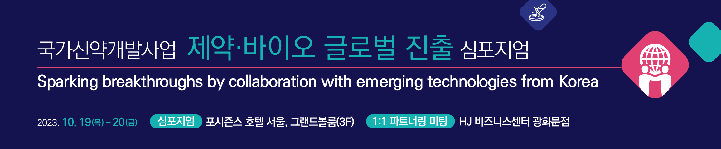 2023년 10월 19일 (목) 09:30 부터 2023년 10월 20일 (금) 17:00 심포지엄 : 포시즌스호텔 서울, 그랜드볼룸(3층) / 1:1 파트너링 미팅 : HJ비즈니스센터 광화문점